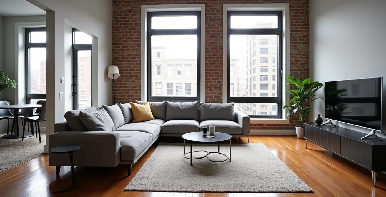 L’erreur la plus commune dans un petit condo est de plaquer un sectionnel massif dans un coin, bloquant ainsi l’accès le plus précieux durant l’été montréalais : le balcon. Pour éviter cet écueil, la règle d’or est de toujours préserver un passage fluide d’au moins 90 cm (environ 36 pouces) vers les portes et les fenêtres. C’est la largeur minimale pour une circulation confortable sans avoir à se faufiler.